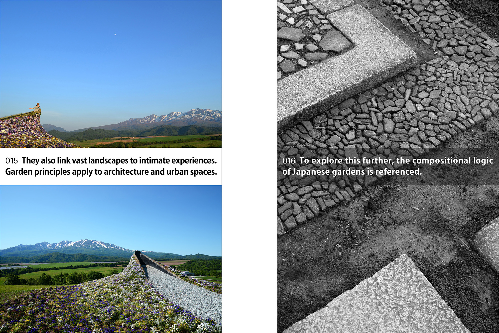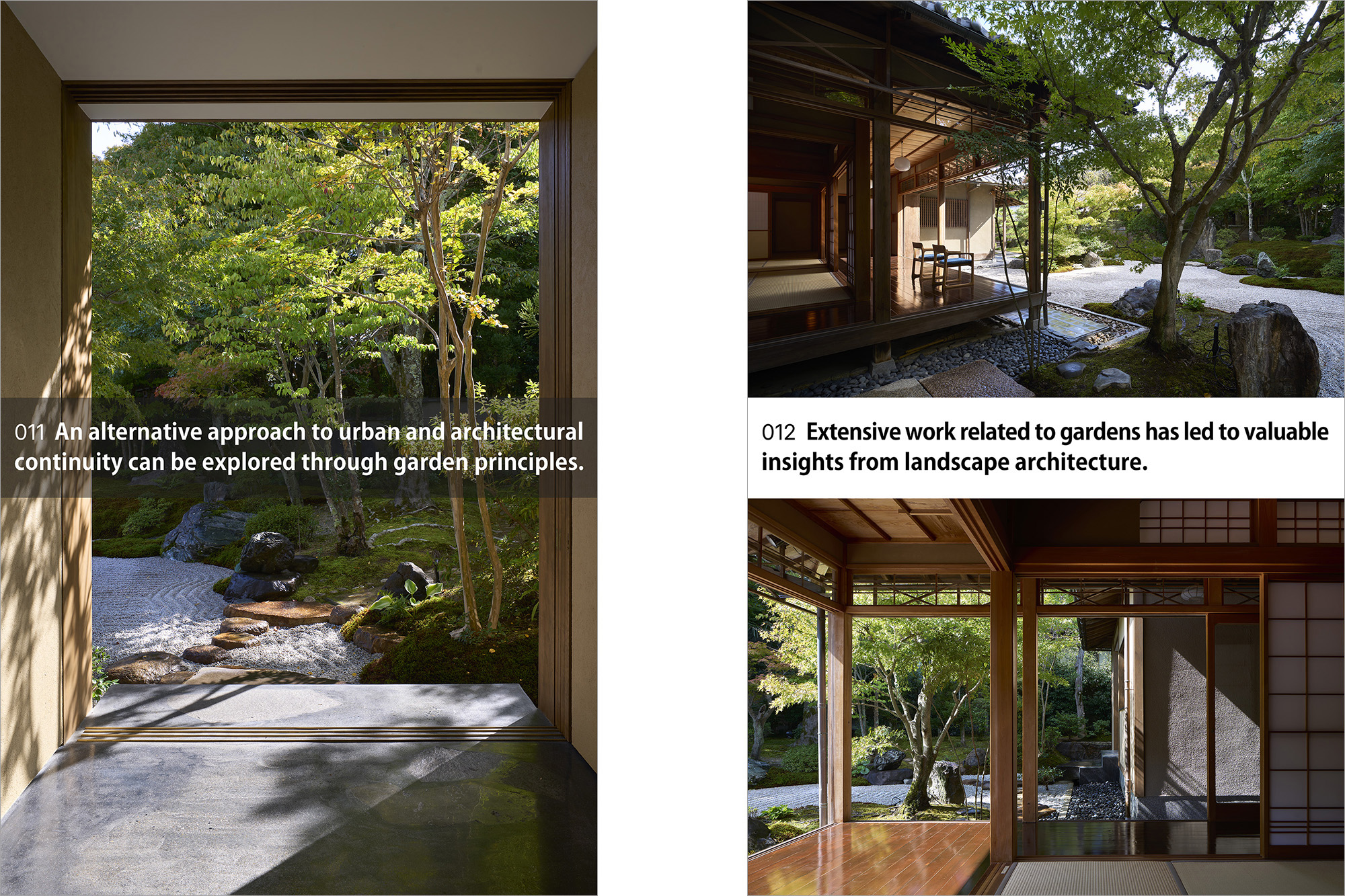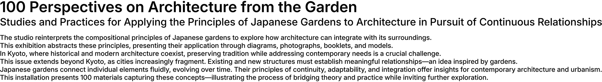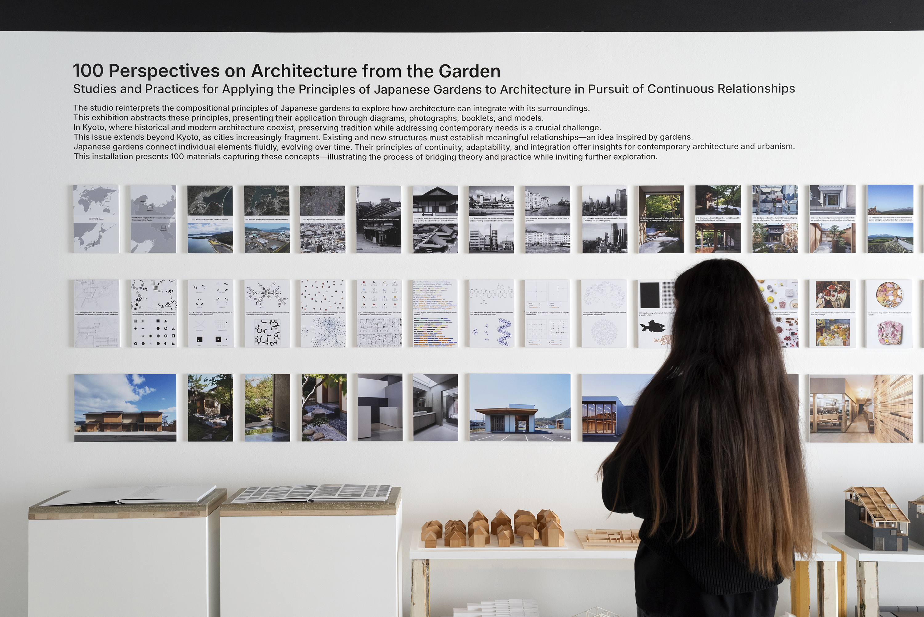 Our exhibition explores the application of principles found in Japanese gardens to architectural thinking and practice. It was presented as a single narrative, composed of 100 material elements, including models, drawings, photographs, and a booklet.