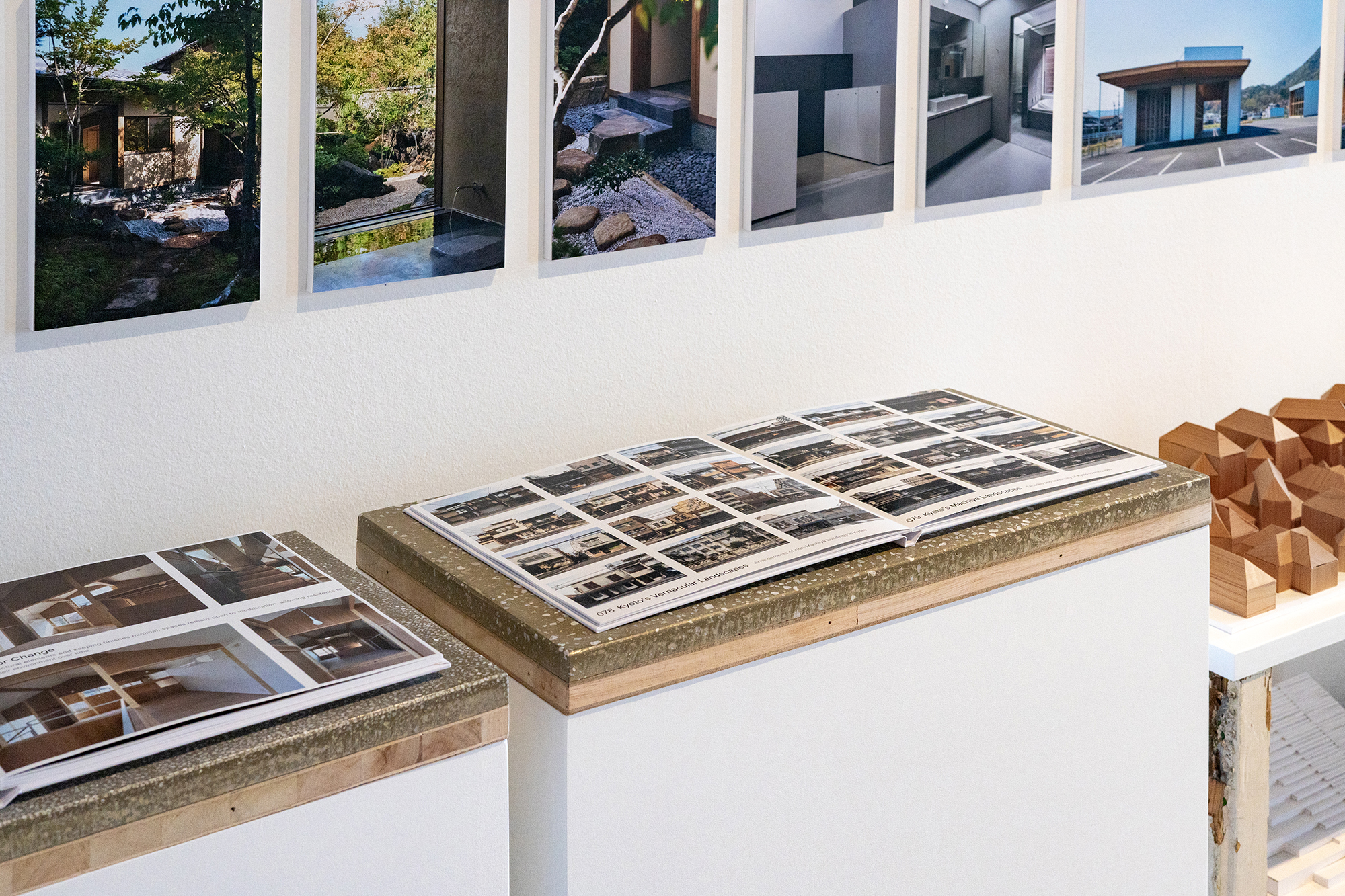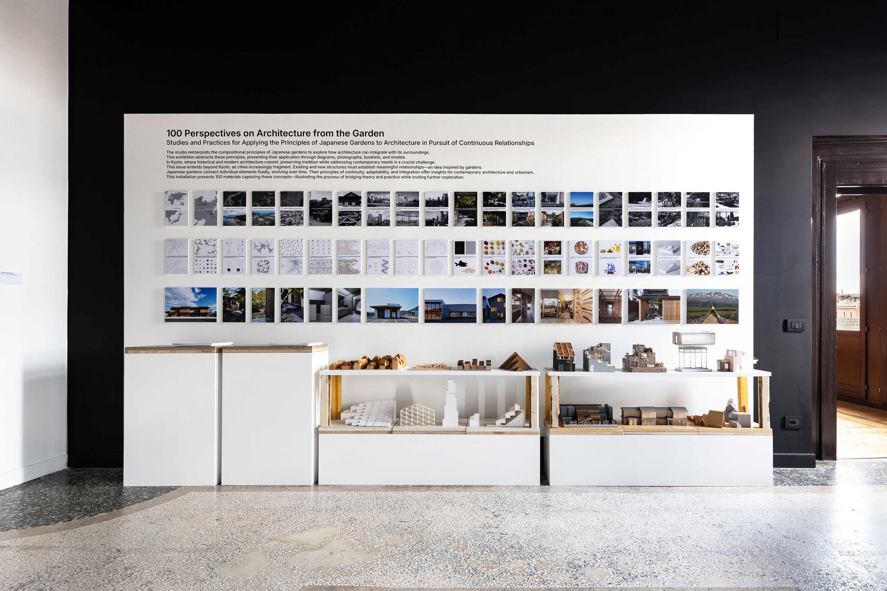 私たちは、日本庭園の構成原理を建築の思考と実践に応用する試みを、一つの物語として提示し、模型、図面、写真、ブックレットなど、100点のマテリアルによる展示構成とした。